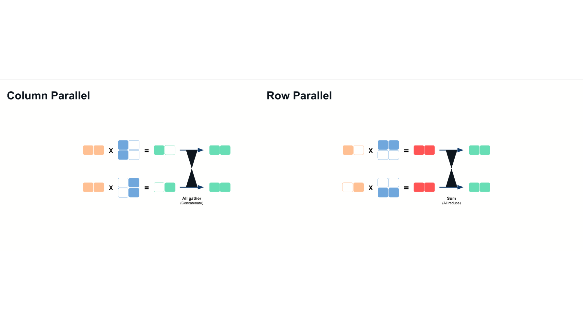 2. Row Parallelism: Splitting matrices along rows, summing partial results post-computation.