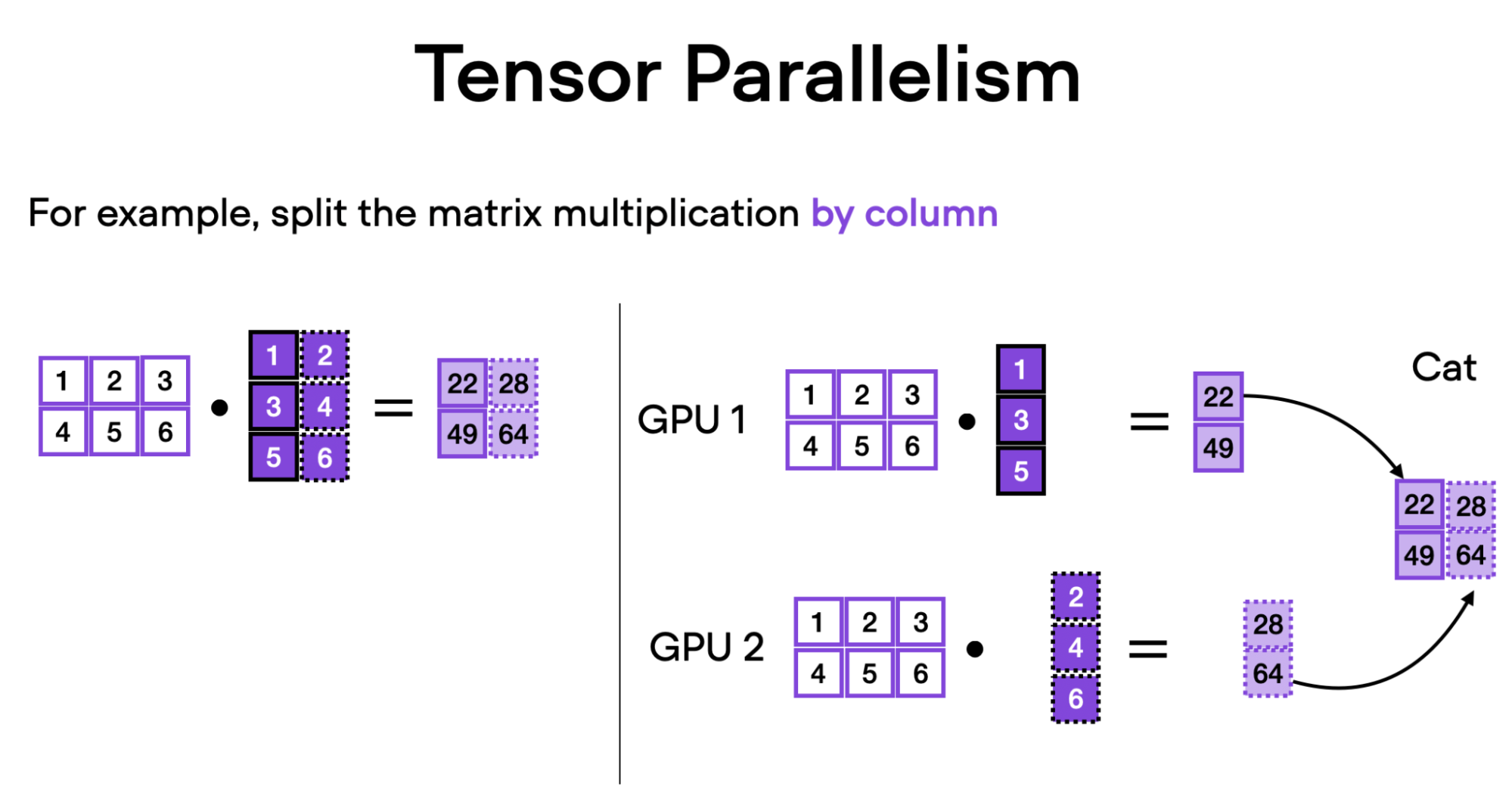 1. Column Parallelism: Splitting weight matrices along columns and concatenating results after computation.