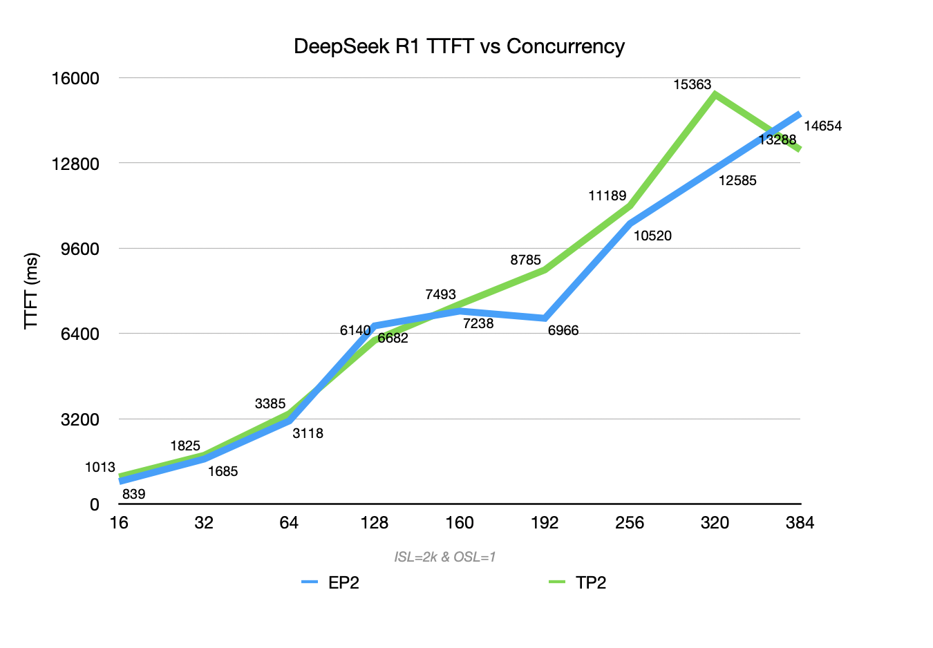 EP2 (blue curve) reaches a throughput ceiling of 22476 TGS, outperforming TP2 (green curve) in both throughput and the growth slope of TTFT. This benefits from EP's typical "large packet, low frequency" communication pattern, which better utilizes the high bandwidth of RDMA/NVLink under high concurrency.