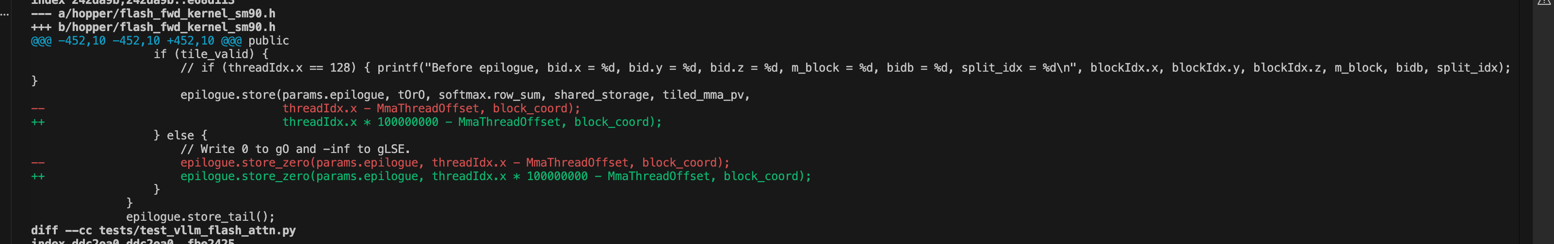 The faulty source code calls some CUTLASS functions, and the function containing it also gets inlined by an upper-level caller. In this case, cuda-gdb cannot correctly associate the line. In fact, it does not show any line information around the error location. Even when it shows the correct line, it only displays the last inline frame, which is File "/data/youkaichao/data/vllm_flash_attn/csrc/cutlass/include/cute/arch/copy_sm90.hpp", line 93 inlined at "/data/youkaichao/data/vllm_flash_attn/csrc/cutlass/include/cute/arch/util.hpp", line 158—an internal inline expansion of the CUTLASS function that is still unhelpful for debugging the underlying issue.