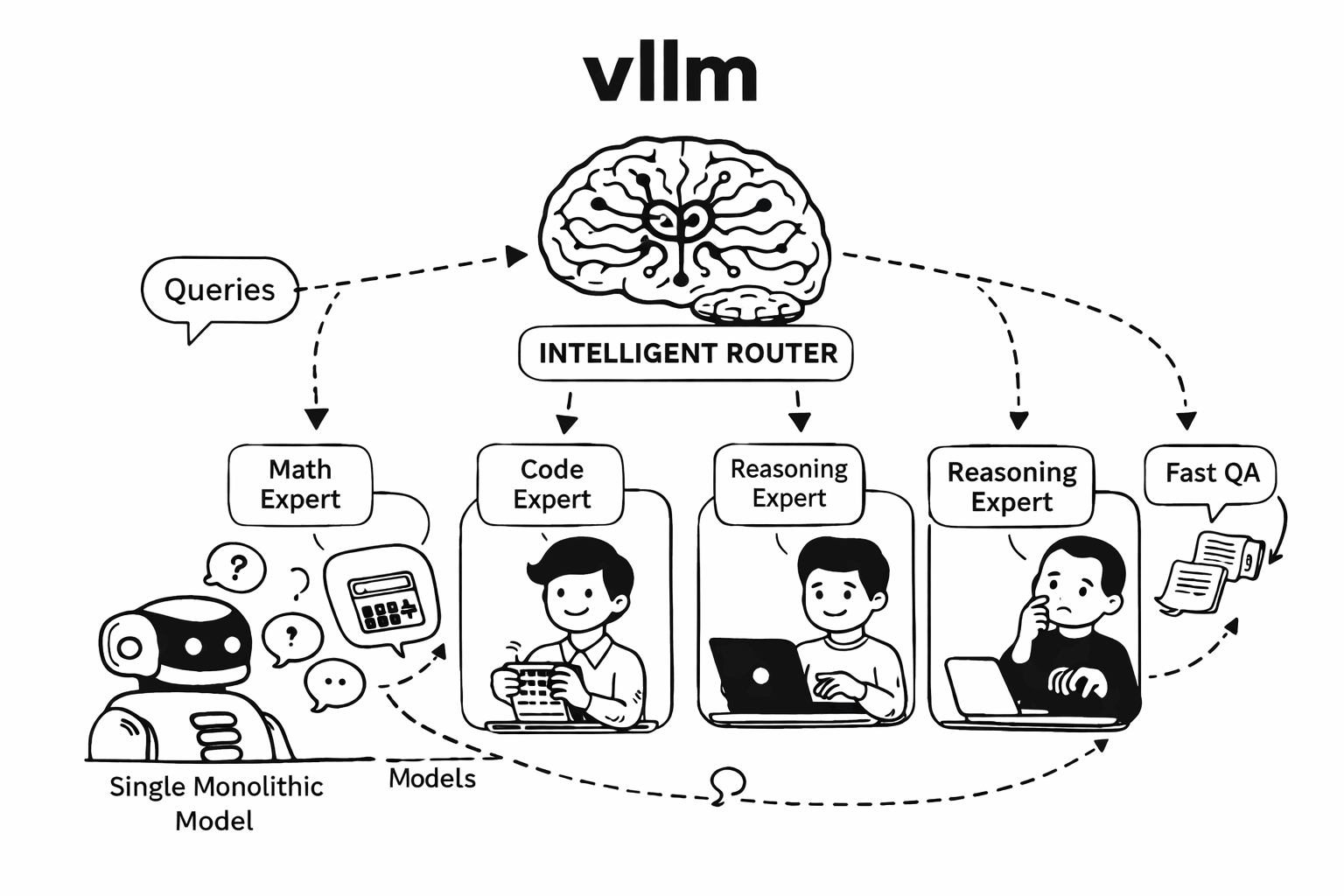 With vLLM Semantic Router (vLLM-SR) v0.1, we've deployed a live MoM system on AMD MI300X/MI355X GPUs that demonstrates these capabilities in action—routing queries across 6 specialized models using 8 signal types and 11 decision rules with the performance boost.