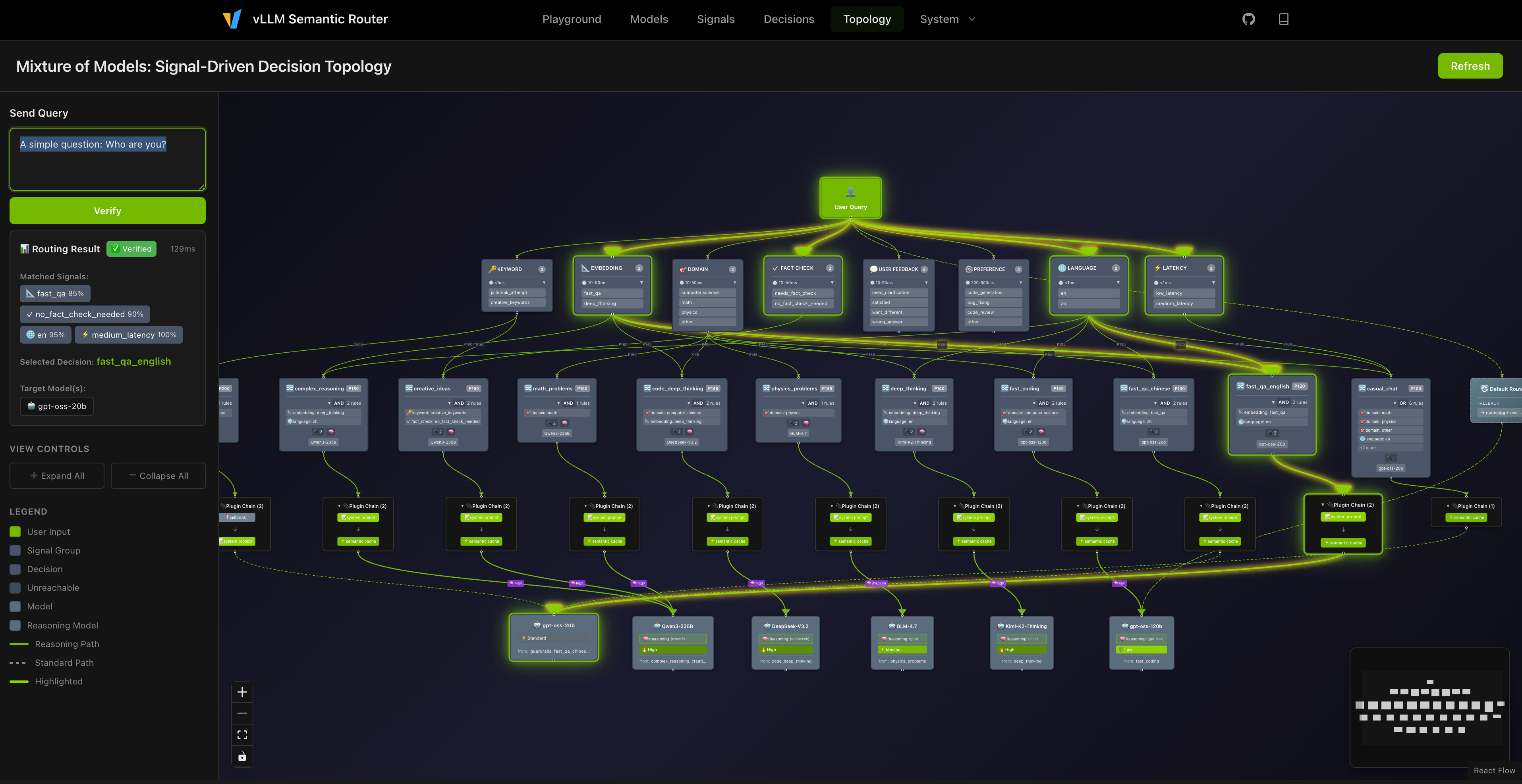 One highlight worth emphasizing: we've implemented a topology visualization capability. Beyond displaying static signal-decision relations, it reveals real-time thinking chains triggered by different queries—like watching a giant neural network built from semantics come alive. Each question illuminates different pathways through the model constellation, making the MoM routing logic intuitive and debuggable.