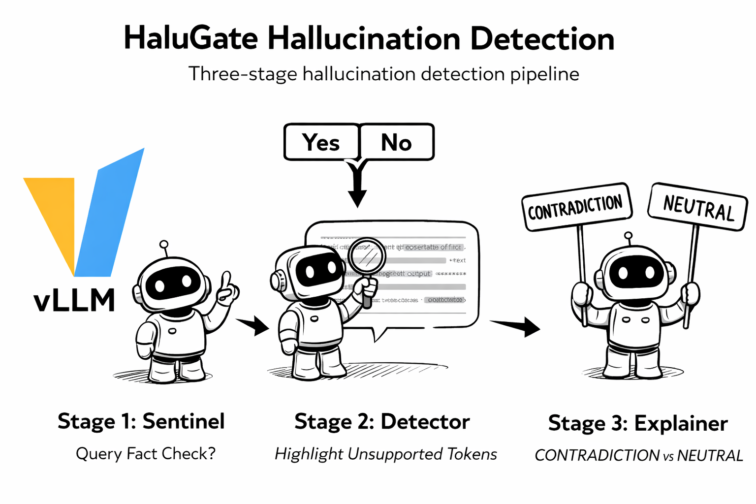 Stage 3: HaluGate Explainer – NLI-based classification explaining why each flagged span is problematic (CONTRADICTION vs NEUTRAL).